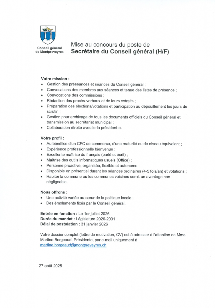 Mise au concours du poste de Secrétaire du Conseil général (H/F)